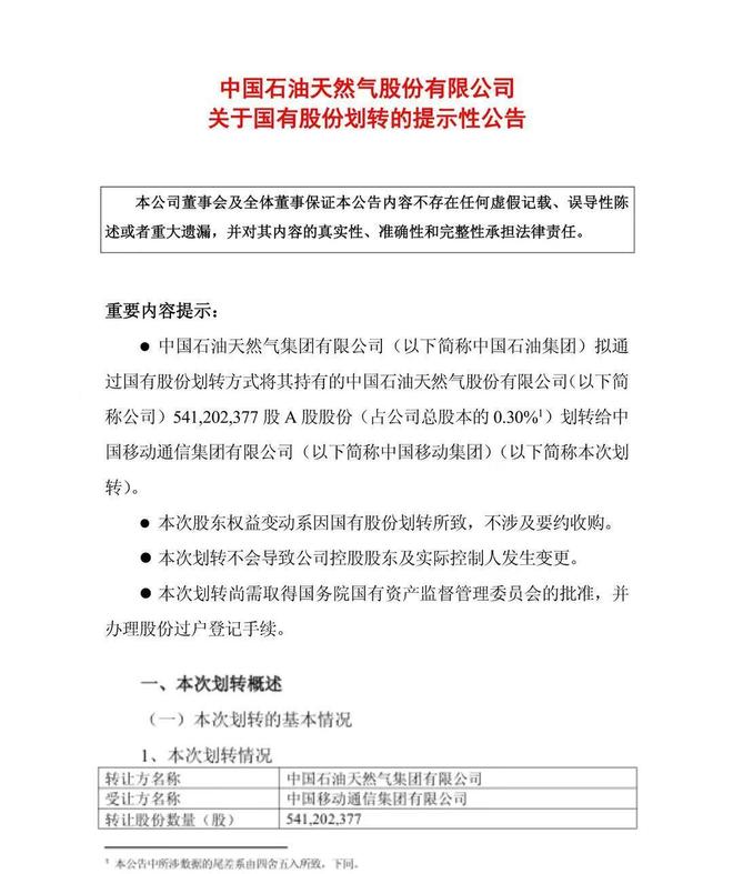 According to the Red Star Capital Bureau on September 3, on the night of September 2, an announcement issued by the China National Petroleum Corporation (from therefore referred to as "China Petroleum") showed that the control of the shareholder of China National Petroleum (from here Petroleum (Accounting for 0. Total Capital Sharing) at China Mobile Communications Group Co, LTD (from therefore referred to as "China Mobile Group") free of charge by moving state shares. An announcement screenshot released by China Petroleum before this move, the China Mobile Group held 178.7943 million sharing China Petroleum through the Subsidiary of China Mobile Communications Co, LTD, providing 0.10% of the total capital of China Petroleum. After this move, the China Mobile Group and the sIts ubsidiary holds a total of 719.997 million shares of China petroleum, which costs 0.39% of the total sharing of中国石油关于交易的背景和此转移的目标Ational Petroleum表示,此举是为了加深中国国家石油公司与中国移动集团之间的战略合作,扩大合作范围,优化公司的股权结构,并获得了放大的福利,获胜的合作和共同的发展。该公告表明,股东权益的变化是由州股票转让造成的,并且不参与软索要约,也不会导致中国石油股东控制和实际压制的变化。中国石油集团和中国移动集团已签署了共享转移协议。 ISIT的这一转变仍需要国家财产和国务院管理局的批准,股份的转让仍需要注册方法进行共享转让。 (来源:安全日 - SUN)